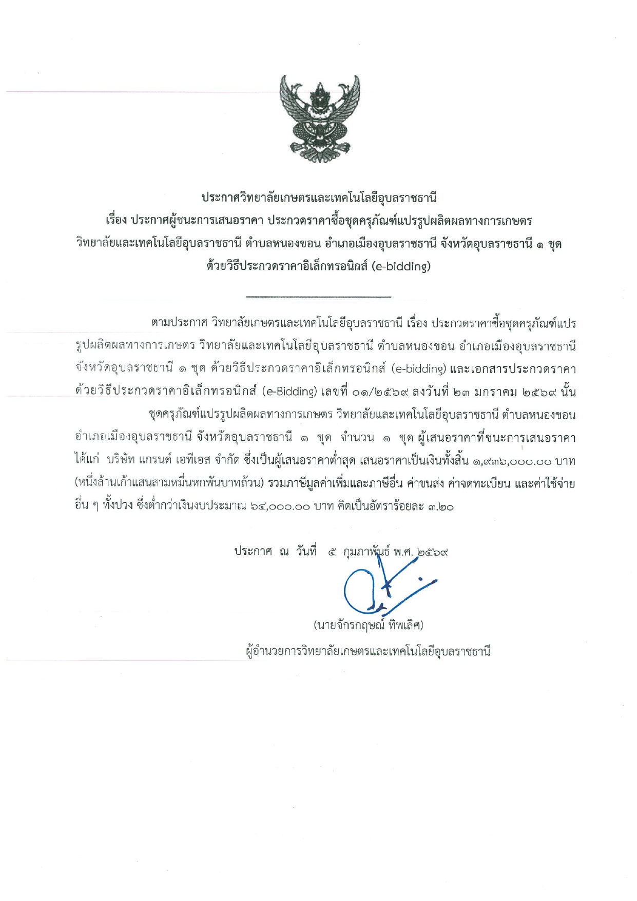 ประกาศวิทยาลัย เรื่อง ประกวดราคาซื้อชุดครุภัณฑ์แปรรูปผลิตผลทางการเกษตร วิทยาลัยเกษตรและเทคโนโลยีอุบลราชธานี ตำบลหนองขอน อำเภอเมือง จังหวัดอุบลราชธานี 1 ชุด ด้วยวิธีประกวดราคาอิเล็กทรอนิกส์ (e-bidding) [23 มกราคม 2569]